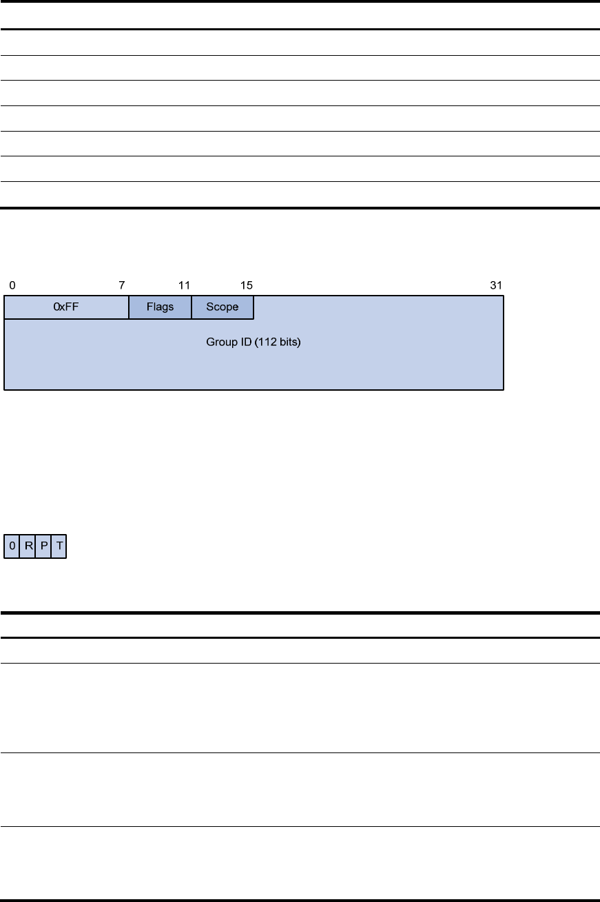 The following describes the fields of an IPv6 multicast address, as shown in Figure 4: