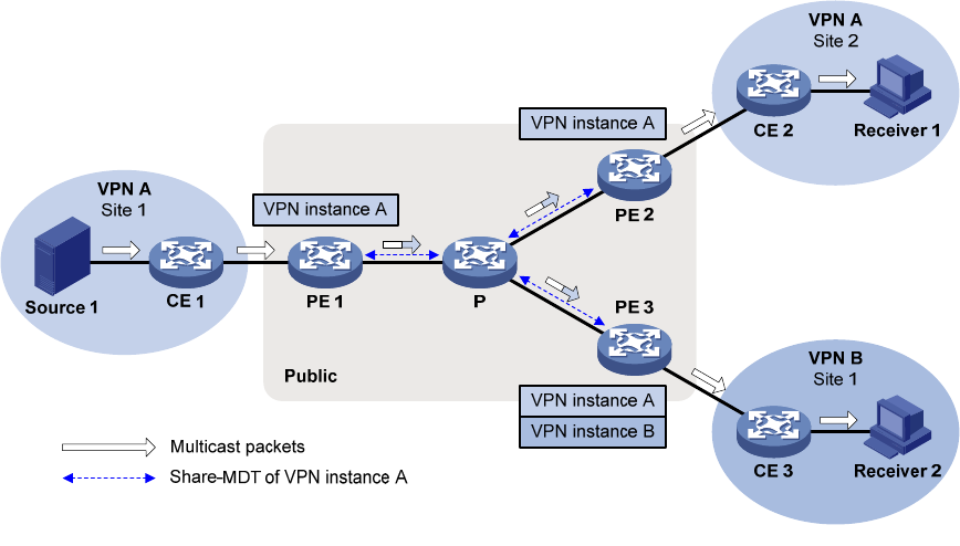 For a VPN instance, multicast data transmission on the public network is transparent. The MTIs at the