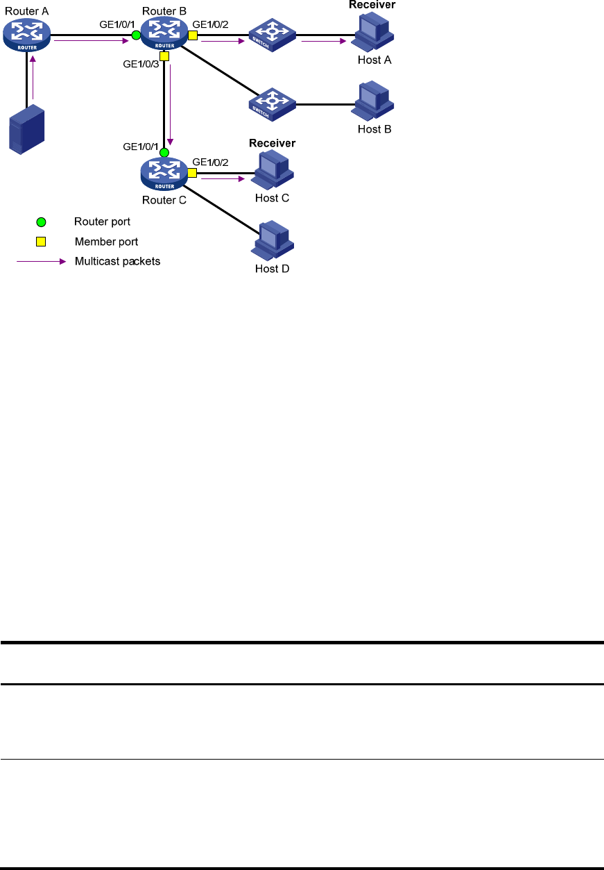 routers and IGMP queriers. In the figure, GigabitEthernet 1/0/1 of Router B and GigabitEthernet