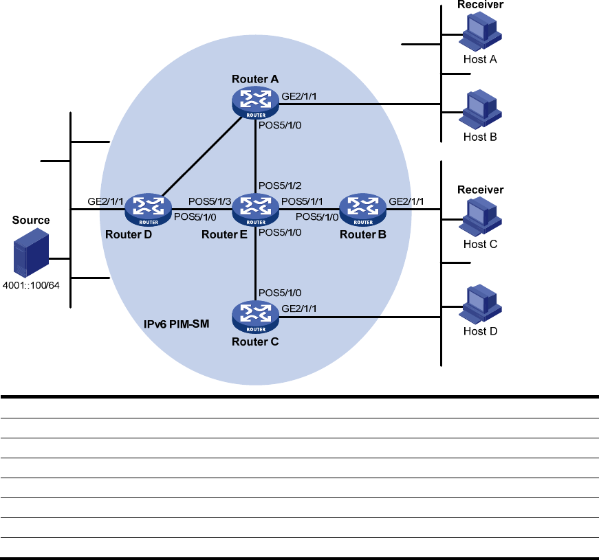 Router C GE2/1/1 2001::2/64 POS5/1/2 1003::2/64