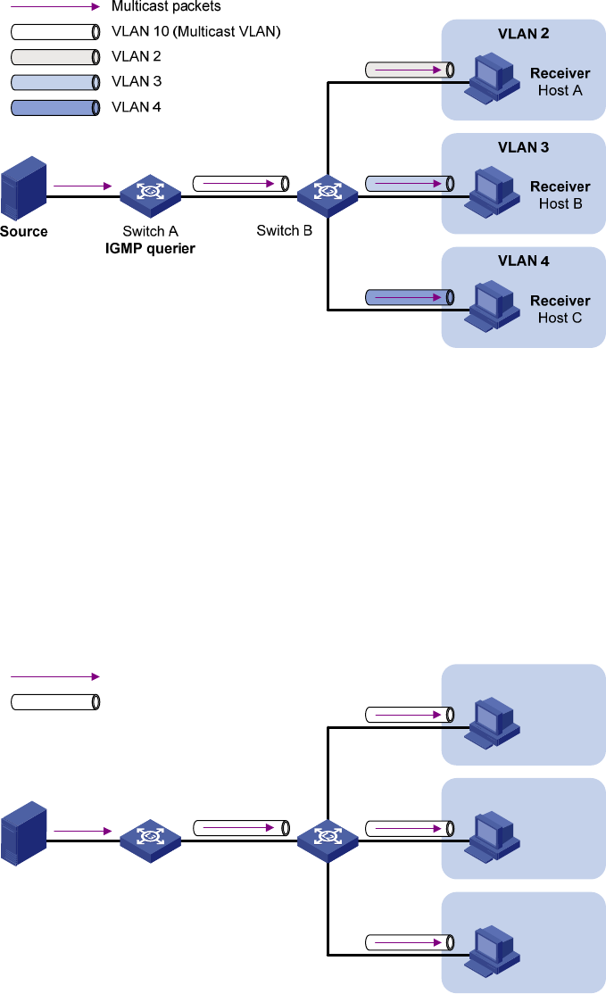 multicast data to Switch B. Switch B distributes the data to the multicast VLAN's sub-VLANs that contain