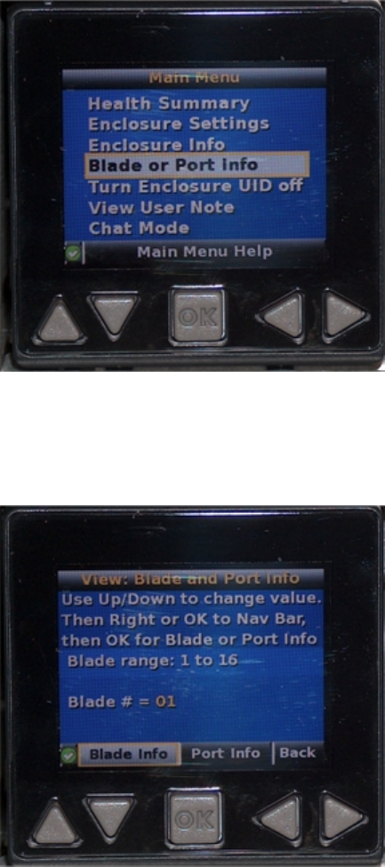 3. Press OK. The View Blade and Port Info screen displays on the front display panel.