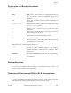 Preface Typographic and Keying Conventions This guide uses the following typographic conventions: Bold Bold words or characters represent system elements that you must use literally, such as commands, options, and pathnames. Italic Italic words or characters represent variable values that you must supply. Constant width Examples and information that the system displays appear in constant width typeface. [] Brackets enclose optional items in format and syntax descriptions.