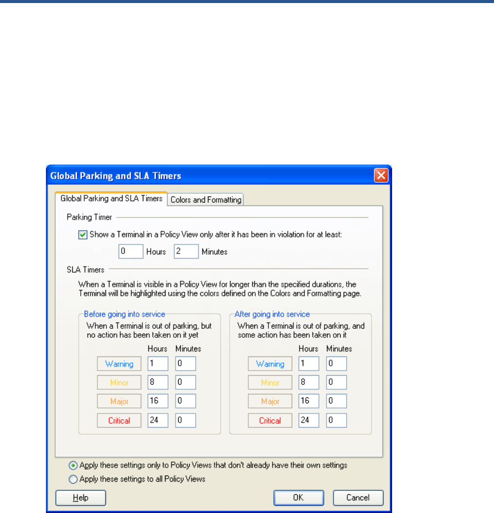 You can set the Parking and SLA Timers for Policy Views globally for all the Terminals in your environment using