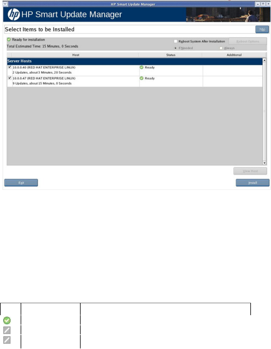 The Select Items to be Installed screen displays the server hosts and the status information.