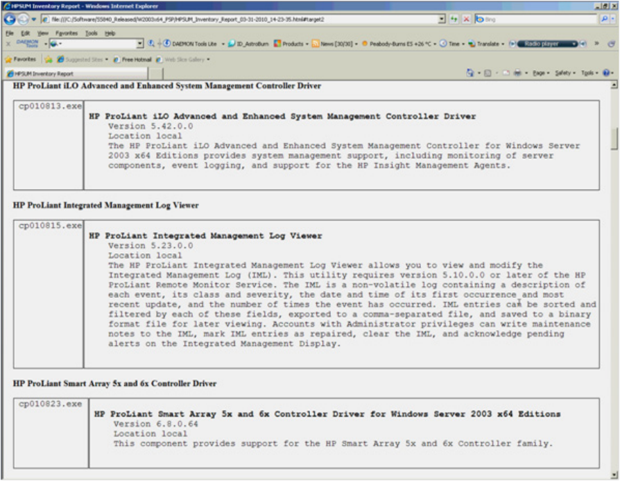 The following figure illustrates the HP SUM Inventory report in HTML format.