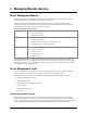 Chapter 3 Managing Remote Servers • Reboot the server to its service partition • View the System Event Log (SEL) for information about recent server activity • View Sensor Data Records (SDRs) for information about sensor characteristics • Review Field Replaceable Unit (FRU) inventories • View Remote Sensor Access (RSA) information • Maintain a Phonebook for managed servers • Run Remote Diagnostic Tests on a managed server • Transfer files to and from the server • Run the server’s shell program • Run servi