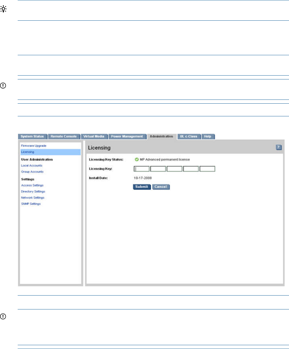 The Licensing page (Figure 34) is used to enter a license key to enable the iLO 2 Advanced Pack