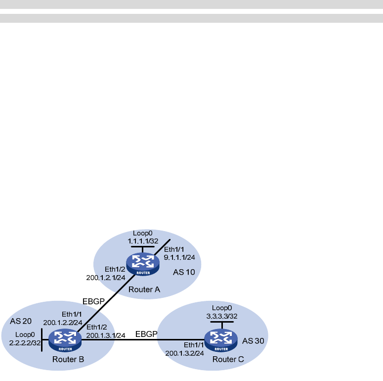 As shown in Figure 66, Router B establishes EBGP connections with Router A and Router C. Configure