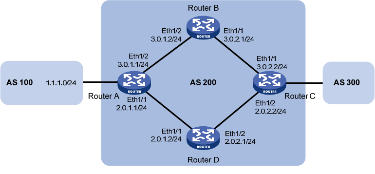[RouterA-bgp] peer 3.0.2.2 as-number 200