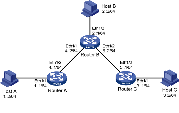 and Host C as 1::1, 2::1, and 3::1.