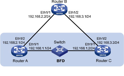Enable BFD for RIP on Ethernet 1/1 of Router A. When the link over Ethernet 1/1 fails, BFD can quickly