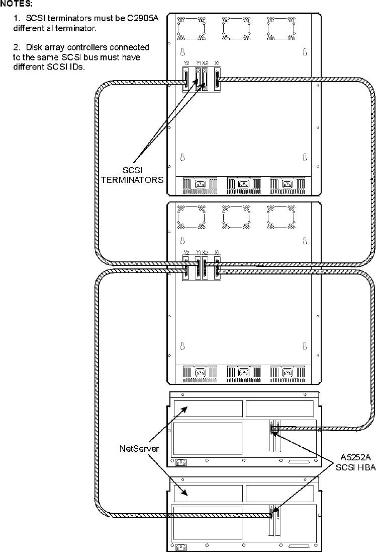 Figure 10. SCSI Bus Cabling for Connecting Multiple Disk Arrays