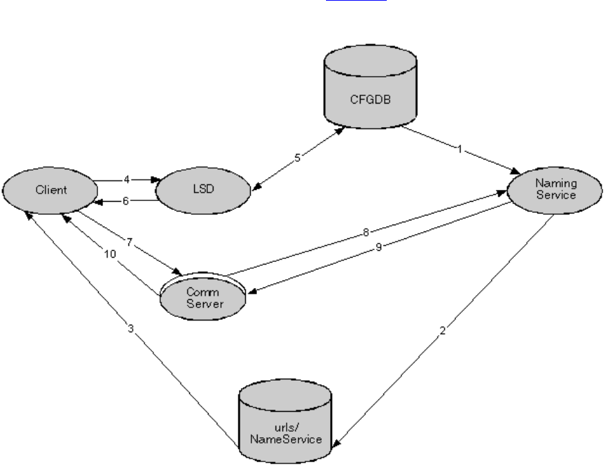 This section describes the flow of messages from a client to and from a single service, the Naming Service, as an example of how the flow might