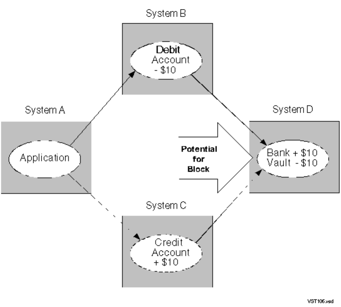 In this figure, the application starts a debit/credit transaction on System A. The debit account is held on