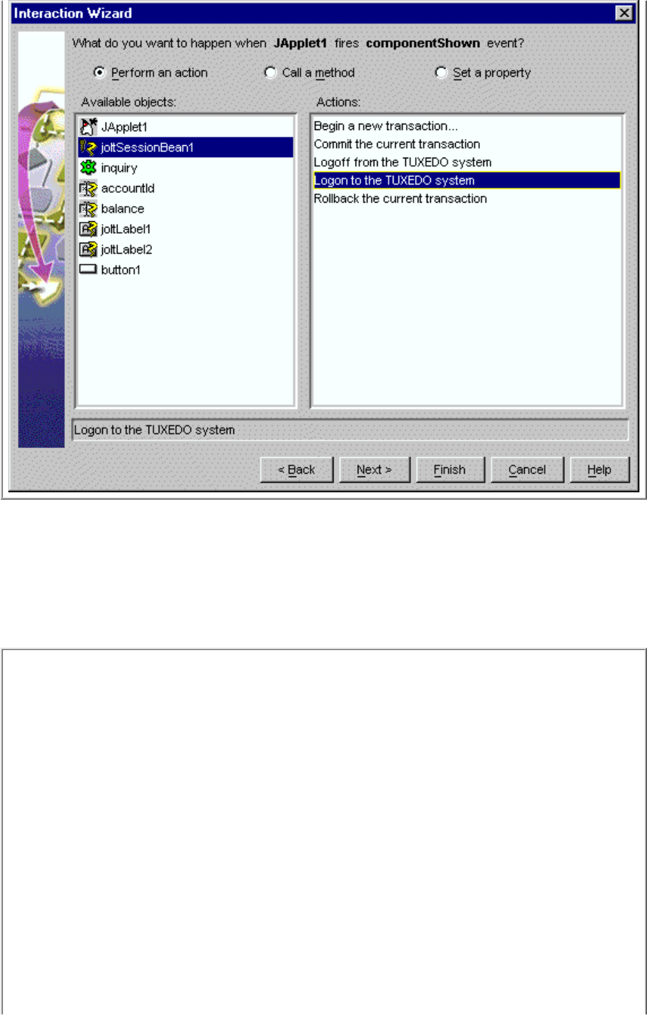 The Interaction Wizard is displayed and asks "What event in joltSessionBean1 do you want to start the