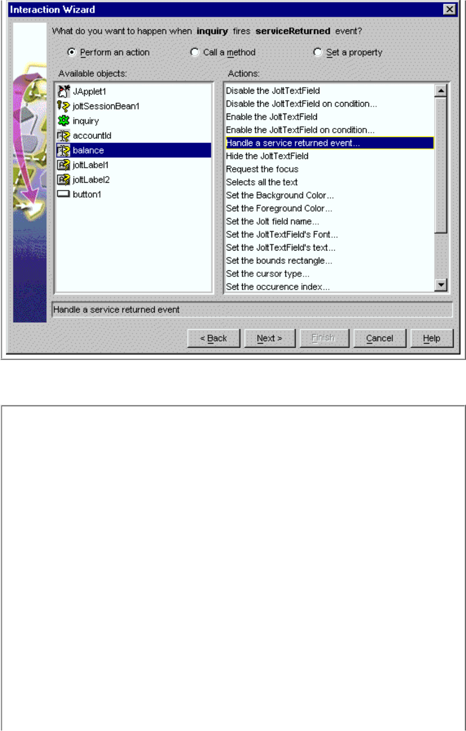 Select "balance" as the object, and "Handle a service returned event..." as the action. Click Next.
