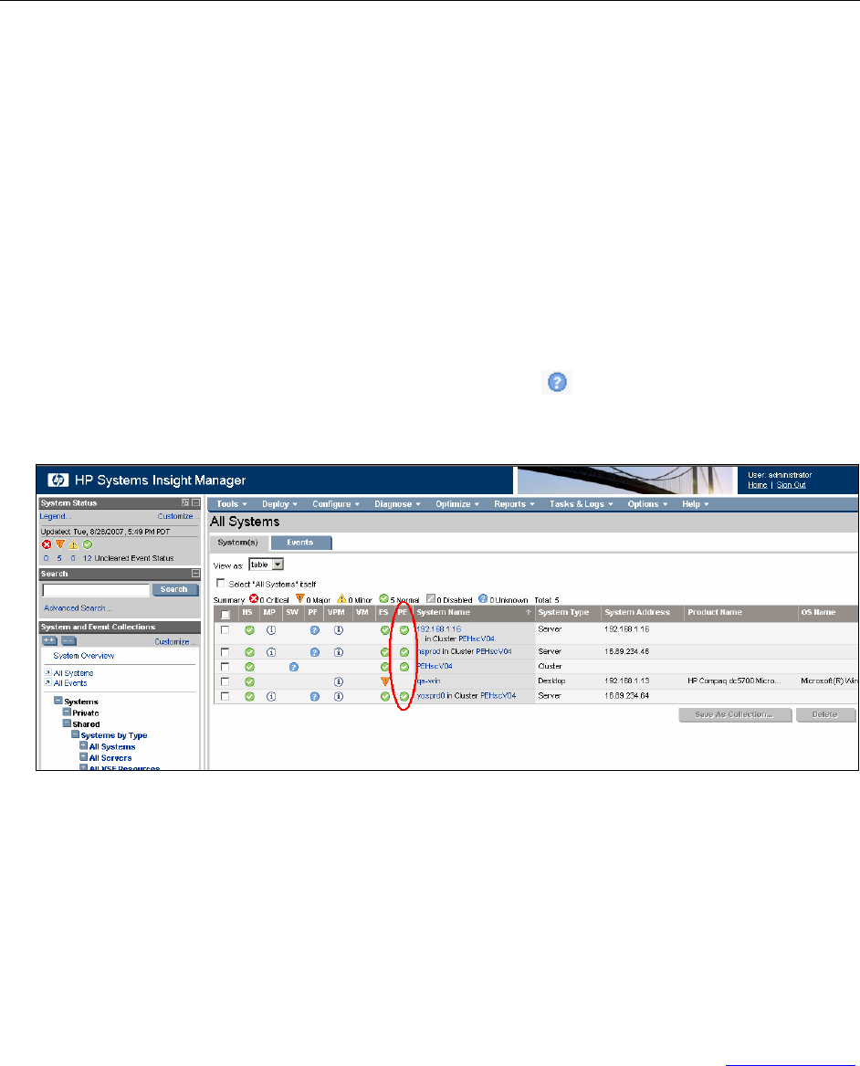 additional status column named PE appears in the System and Cluster tables of HP SIM.
