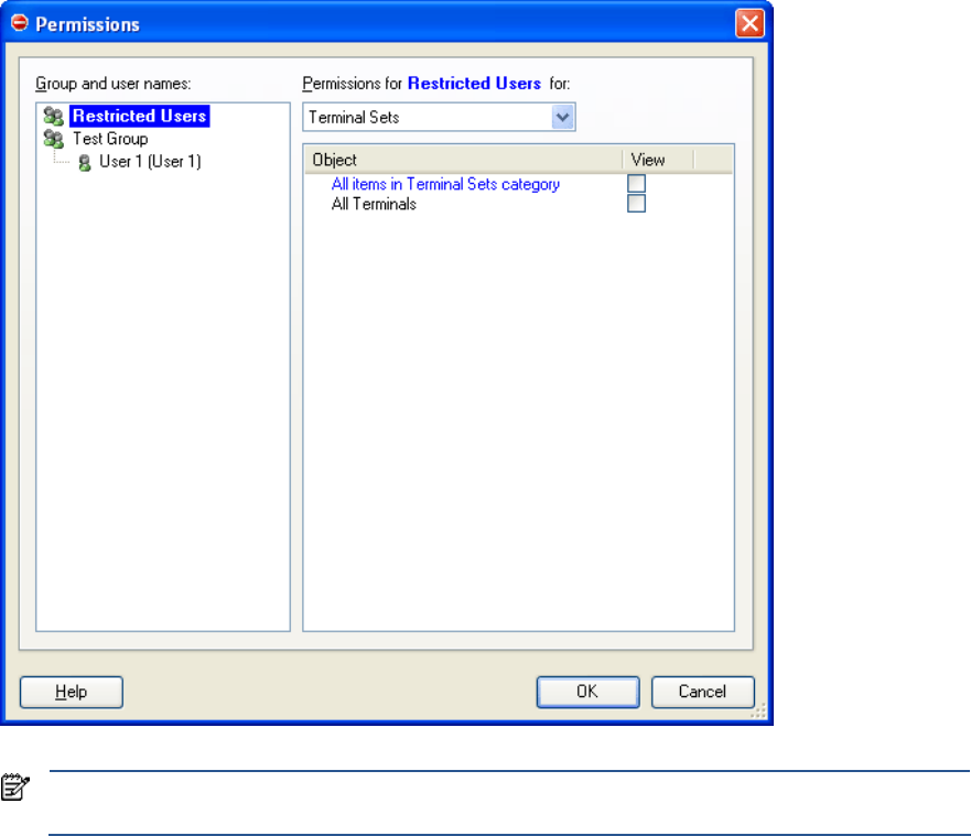 check boxes. The permissions that you can assign (View/Allow/Execute) depend on the category selected