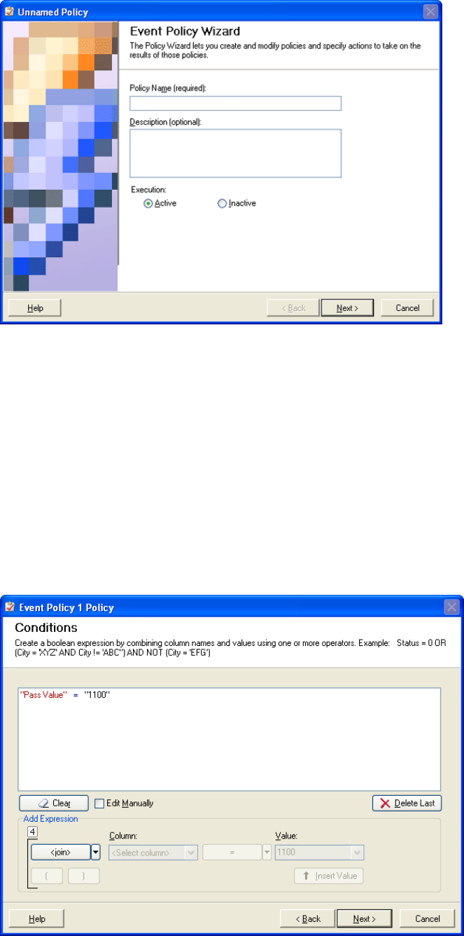 4. The Event Policy Wizard - Conditions page is displayed. Use this page to create a Boolean expression by
