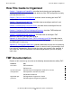 Documentation Description About This Guide Documentation Description • • • • • • • TMF Introduction Read this manual first. It provides a general overview of TMF concepts and capabilities for business professionals, application designers and programmers, and system managers and administrators. TMF Glossary Refer to this manual to look up technical terms used in the TMF documentation set.