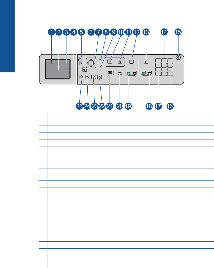 1 Color graphics display (also referred to as the display): Displays menus, photos, and
