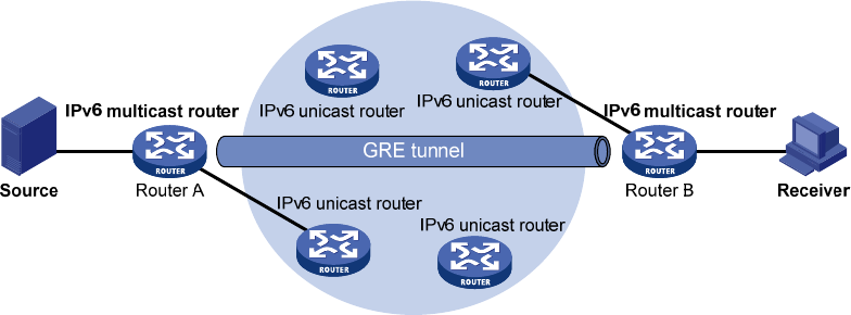 B, Router A encapsulates the IPv6 multicast data in unicast IPv6 packets, and forwards them to Router B