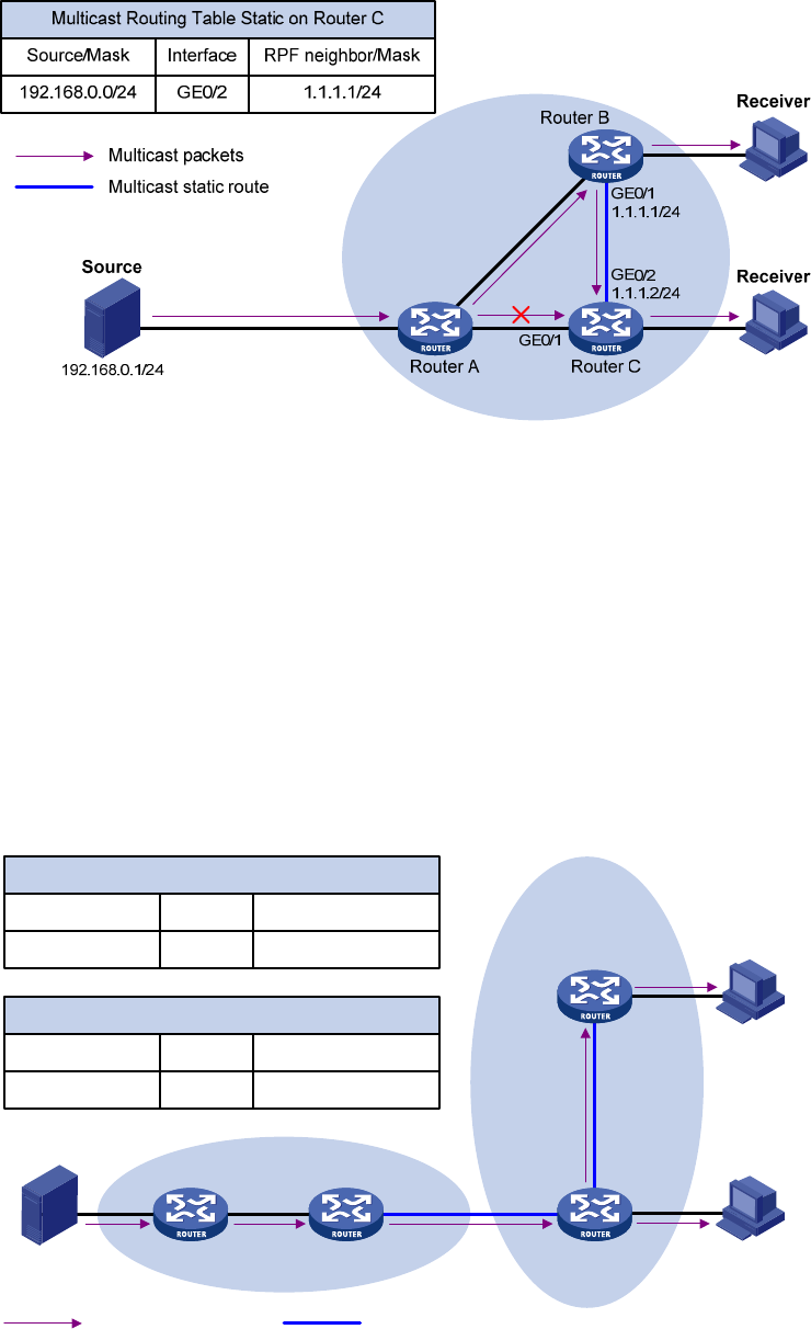 Router C, which is the unicast route between the two routers. When a static multicast route is configured