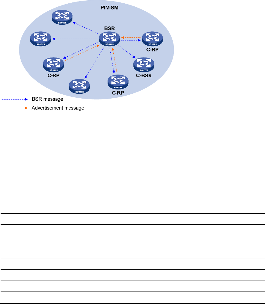 and RPs. The BSR then encapsulates the RP-set in the BSMs that it periodically originates and floods the