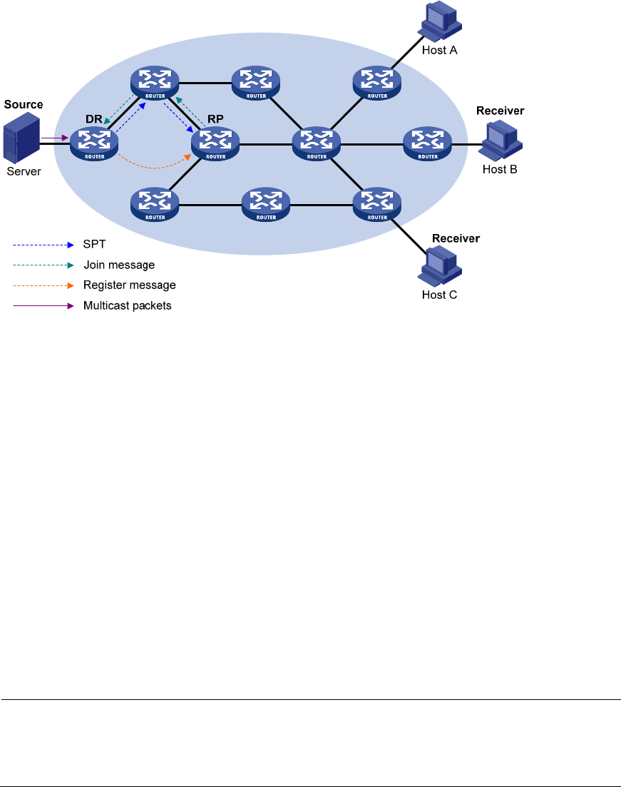 to SPT, the DR at the multicast source side keeps encapsulating multicast data in register messages, and the