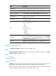 Aggregation Interface: Bridge-Aggregation10 Local: Port Number: 2 Port Priority: 32768 Oper-Key: 2 Flag: {ACDEF} Remote: System ID: 0x8000, 000f-e267-6c6a Port Number: 26 Port Priority: 32768 Oper-Key: 2 Flag: {ACDEF} Received LACP Packets: 5 packet(s) Illegal: 0 packet(s) Sent LACP Packets: 7 packet(s) Table 28 Command output Field Description LACP state flags: Flags • • • • • • • • A—LACP is enabled. B—LACP short timeout. C—The sending system detects that the link is aggregatable.