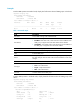 Aggregation Interface: Bridge-Aggregation20 Aggregation Mode: Static Loadsharing Type: NonS Port Status Priority Oper-Key -------------------------------------------------------------------------------GE0/1 U 32768 1 GE0/2 U 32768 1 GE0/3 U 63 1 Table 30 Command output Field Description Load sharing type: Loadsharing Type • Shar—Load sharing. • NonS—Non-load sharing. Port Status Port state: Selected or Unselected.