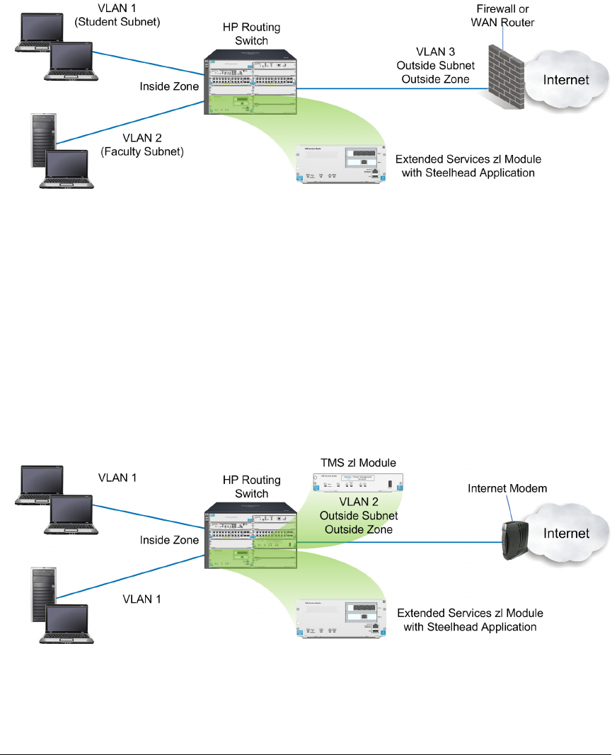 External routing. In this deployment, the HP 5400zl or 8200zl switch has an