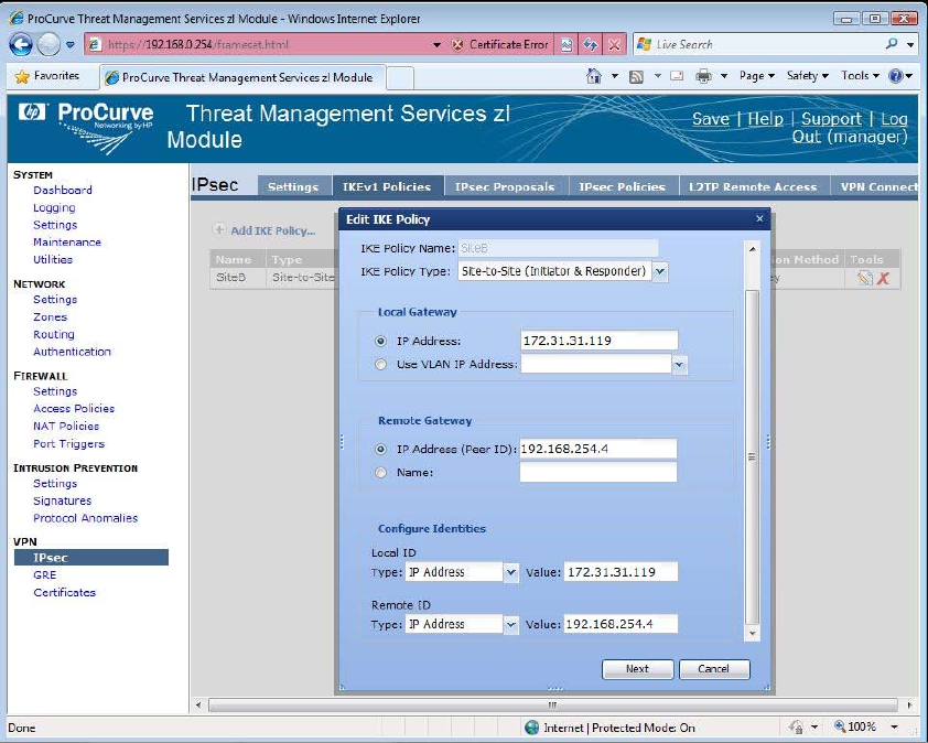 SITE A: We setup a mirror image of the IKE policy on Site A that we did with