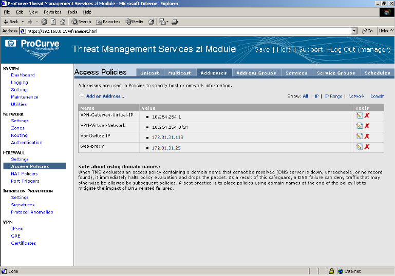 is 10.254.254.0/24. The TMS zl Module is assigned a Virtual IP