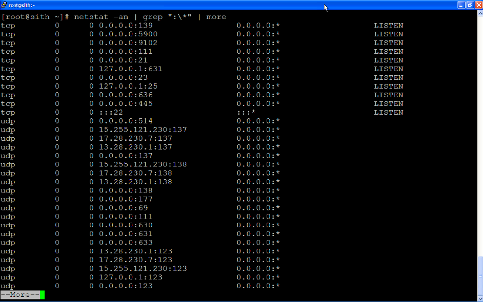 o E.g. 0.0.0.0:23 means all local IP addresses on port 23, and :::22 means all local