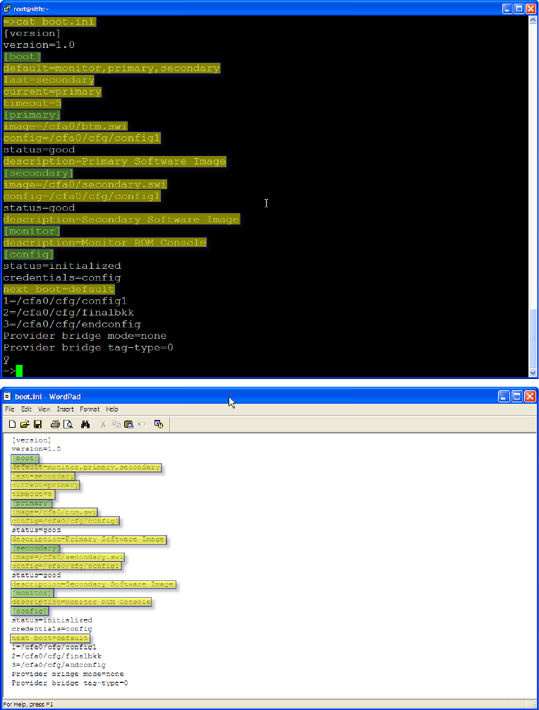first green highlighted section, “[boot]”. We see in the yellow highlighted line immediately