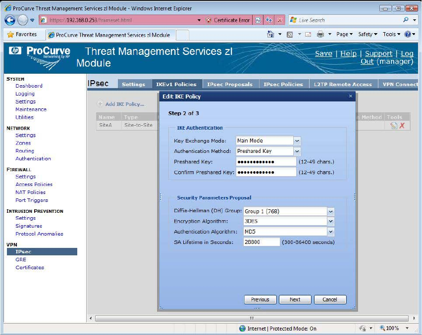 SITE B: Here we select Main Mode and Preshared Key. We are just using