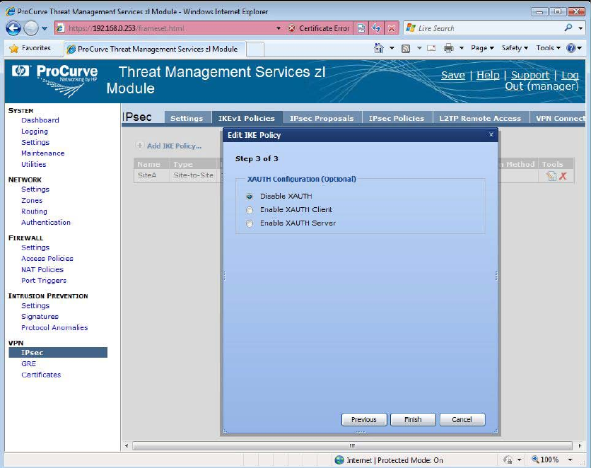 SITE B: Disable XAUTH and click Finish to complete configuration of the