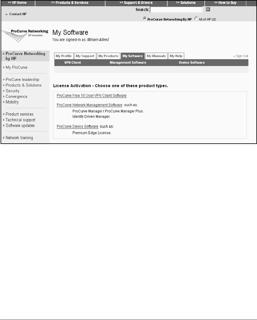 4. Click ProCurve Device Software. You can now begin to generate a license