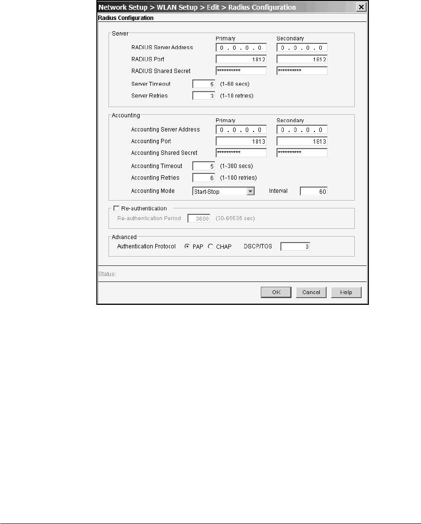 6. In the Radius Configuration screen, under Server, specify settings for your