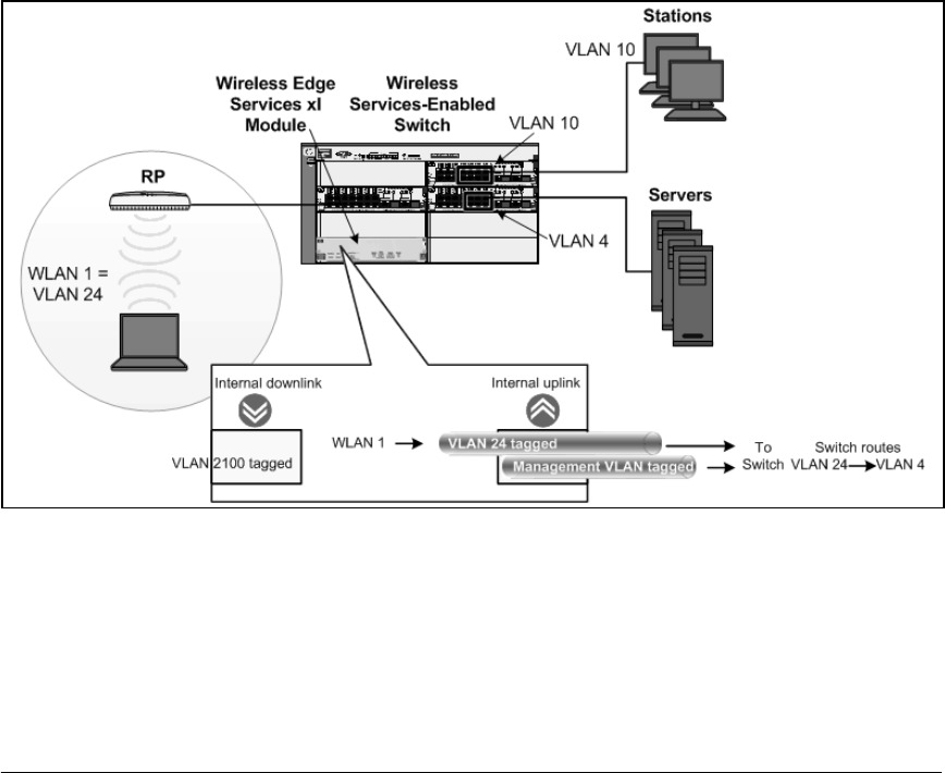 ■ Tag the Wireless Edge Services xl Module’s uplink port for the VLAN.