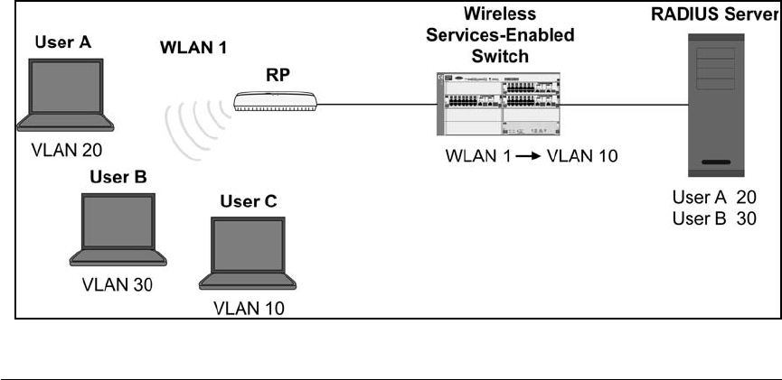 nects to the WLAN, the module forwards its traffic in VLAN 10. When user A