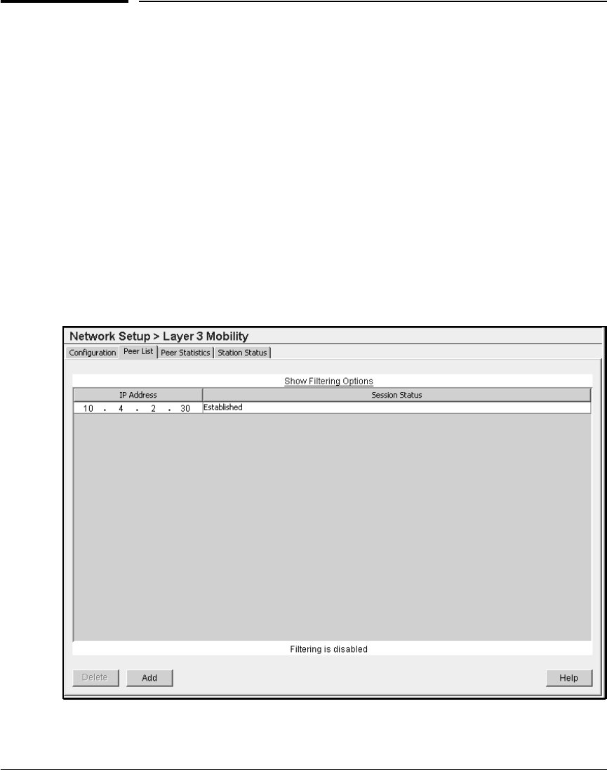 Select Network Setup > Layer 3 Mobility and click the Peer List tab to view each