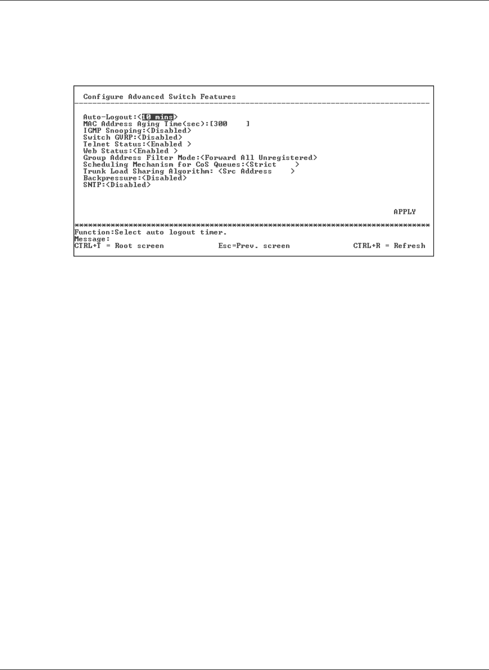 Auto-Logout—Toggle to select the time the RS-232 console and Telnet management
