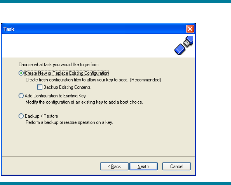 The Task screen allows the user to select what task they would like to perform using the drive key boot