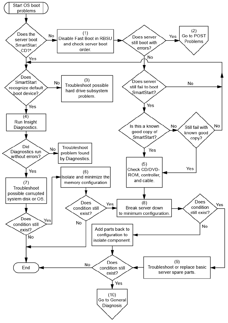 * See the server blade OS boot problems flowchart (on page 77)