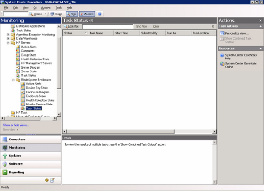 The Task Status view displays task results. HP has no predefined remote tasks, so this view may show no