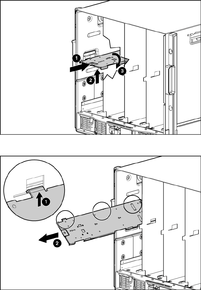 5. Lift the left side of the device bay shelf to disengage the three tabs from the divider wall, and then