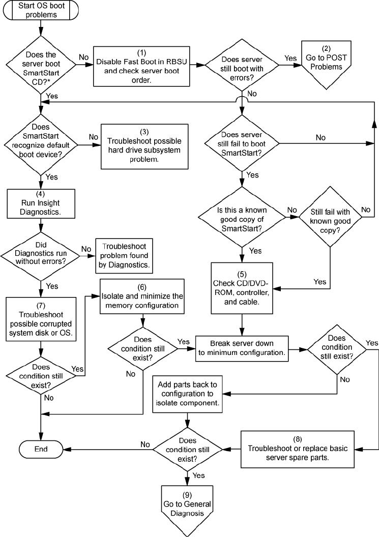 * See the server blade OS boot problems flowchart (on page 64)